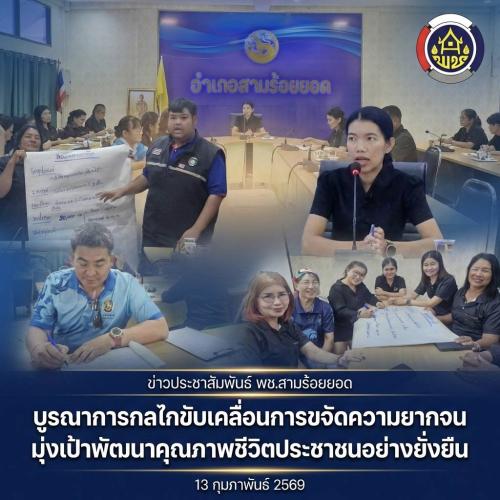 ประจวบคีรีขันธ์ – วันที่ 13 กุมภาพันธ์ 2569 ณ ห้องประชุมคูหาคฤหาสน์ ชั้น 2 ที่ว่าการอำเภอสามร้อยยอด นางสาวมาลี มีอารีย์ พัฒนาการอำเภอสามร้อยยอด เป็นประธานในการประชุมเชิงปฏิบัติการส่งเสริมการบูรณาการกลไกการขับเคลื่อนการขจัดความยากจน เพื่อวางรากฐานการแก้ไขปัญหาความยากจนและพัฒนาคนทุกช่วงวัยตามหลักปรัชญาของเศรษฐกิจพอเพียงในระดับพื้นที่ โดยมีเจ้าหน้าที่พัฒนาชุมชนอำเภอร่วมดำเนินกิจกรรมตามแผนปฏิบัติงาน ประจำปีงบประมาณ พ.ศ. 2569 ซึ่งการประชุมครั้งนี้มีวัตถุประสงค์สำคัญเพื่อสร้างความมั่นคงทางอาชีพและรายได้ รวมทั้งยกระดับคุณภาพชีวิตที่ดีให้แก่ประชาชนในพื้นที่